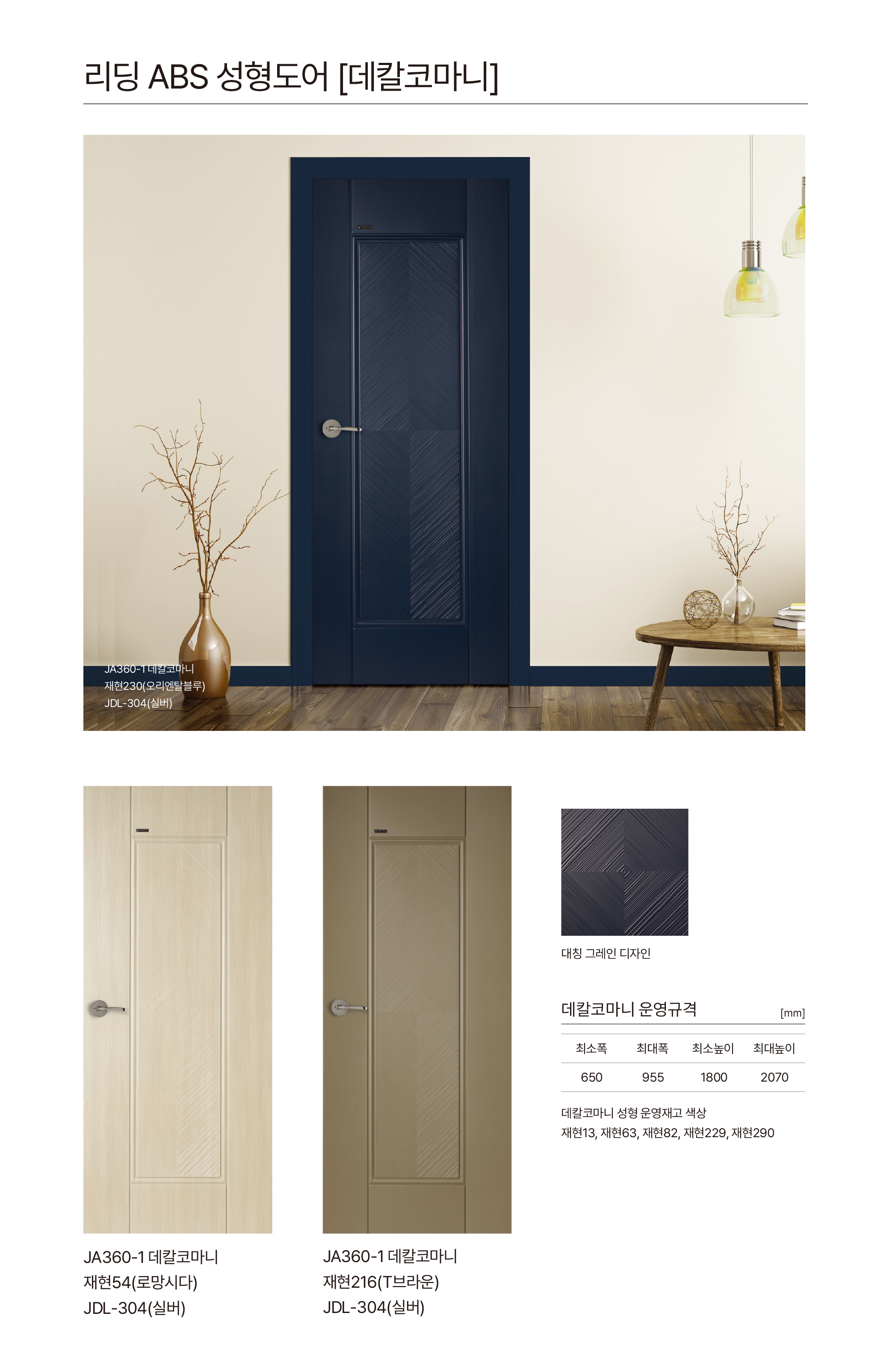 • 멤브레인 도어 휨현상은 실내·외부 온도차 환경에 따라 불량률이 높습니다. 해당환경(발코니·욕실·다용도실 등)에는 ABS도어를 권장합니다.