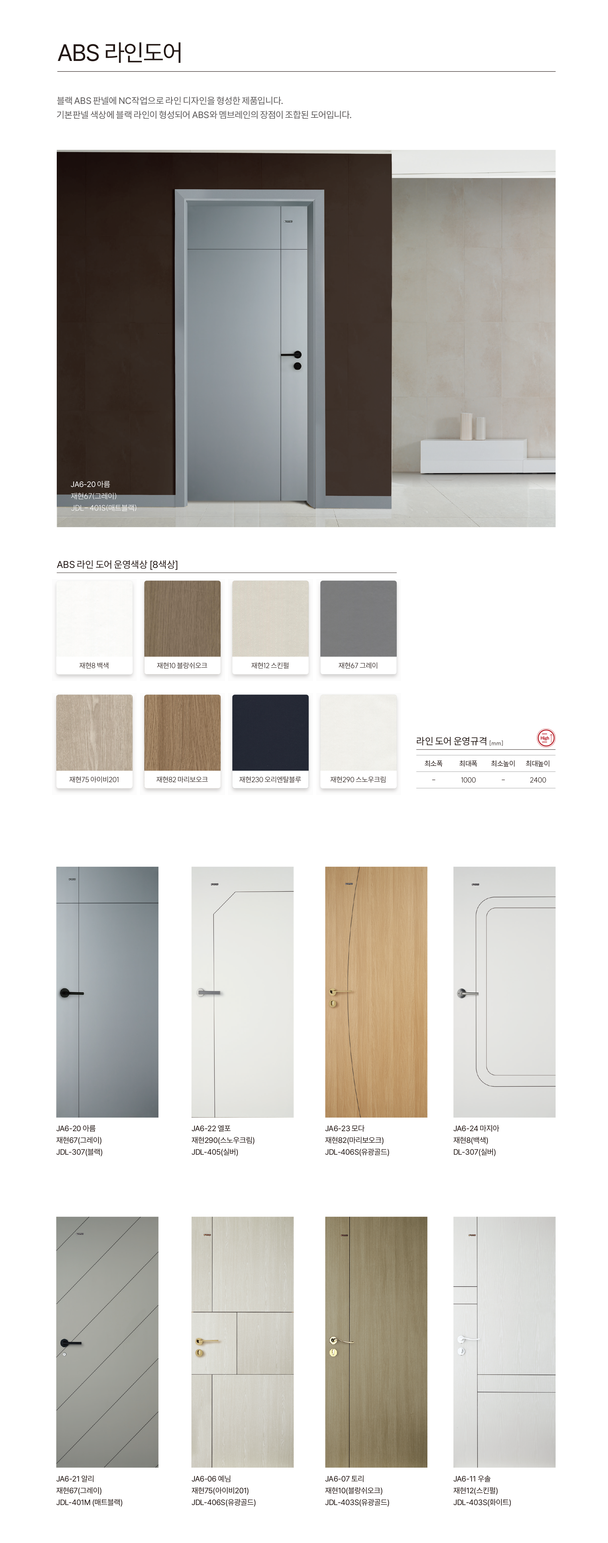 • ABS 도어는 열합지 공정으로 인해 엣지·문틀·몰딩 등의 색상과 차이가 발생합니다. 이색현상은 시트지 색상불량이 아님을 알려드립니다.